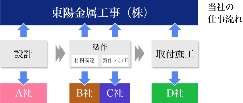 材料調達から機械加工(切断・穴あけ・曲げ・溶接等)、組立、仕上げ(焼付塗装等の表面処理)、最終検査まで協力会社と共に当社の管理で行っております。 勿論、製作のみや製作から取り付けまでも承ります。