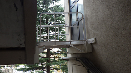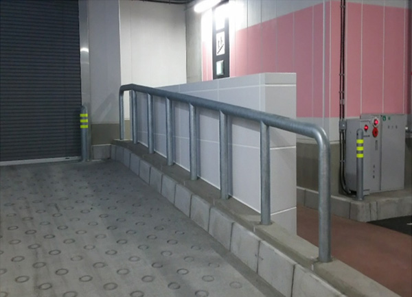 建物が免震構造になっているため、手摺は縁が切れてくし形になっています。