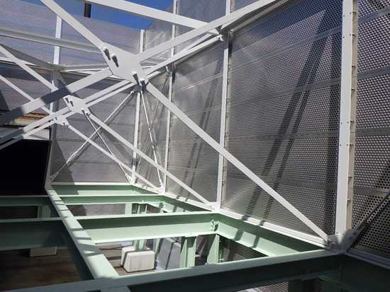 下地としてスチールのアングルを溶接し、パネルにはアルミを使用して焼付塗装で仕上げています。