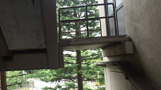 手摺は足元から腐食が進み、RCの歩廊の端部は崩れ、無数のひび割れが見られました。