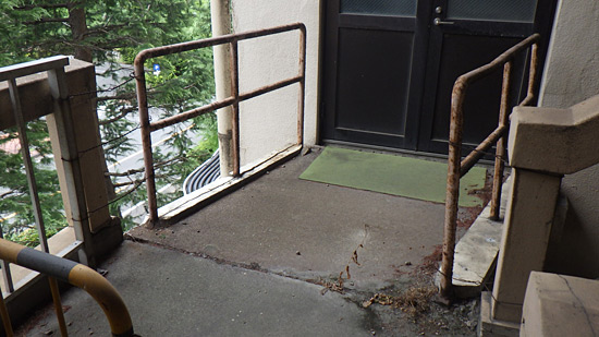 事務所棟を繋ぐ歩廊が経年劣化で今にも崩れそうな様子でした。